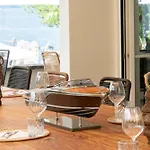 ארוחת הבוקר מוגשת במרפסת. מסעדת המלון עם תפריט רחב מגישה ארוחות צמחוניות עבור האורחים.